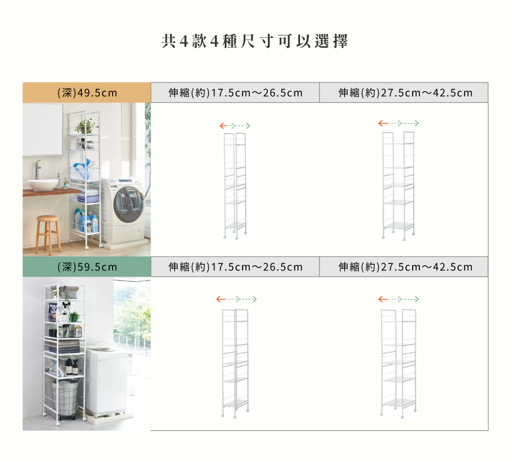 能依間隙空間及欲收納物的數量,適當調節伸縮的衛浴收納層架。