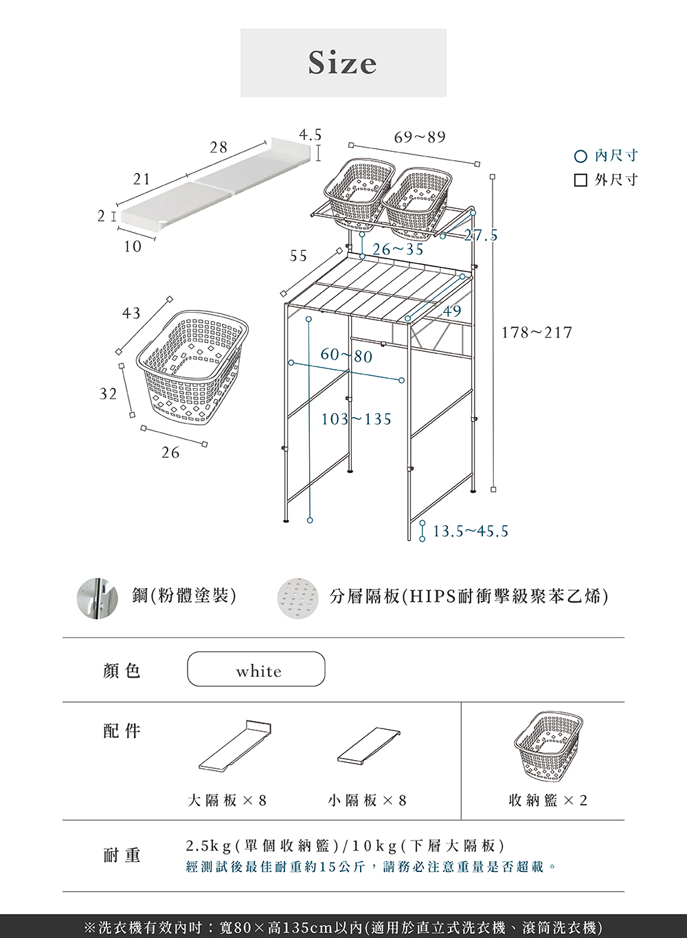 寬度和分層隔板高度可自由調整,能避開水龍頭,根據洗衣機大小完美設置。