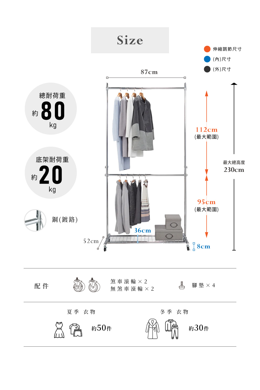 ●上層適合吊掛男士外套、風衣、連身裙等,不同長度的衣物,可依需求調整高度,完美收納。