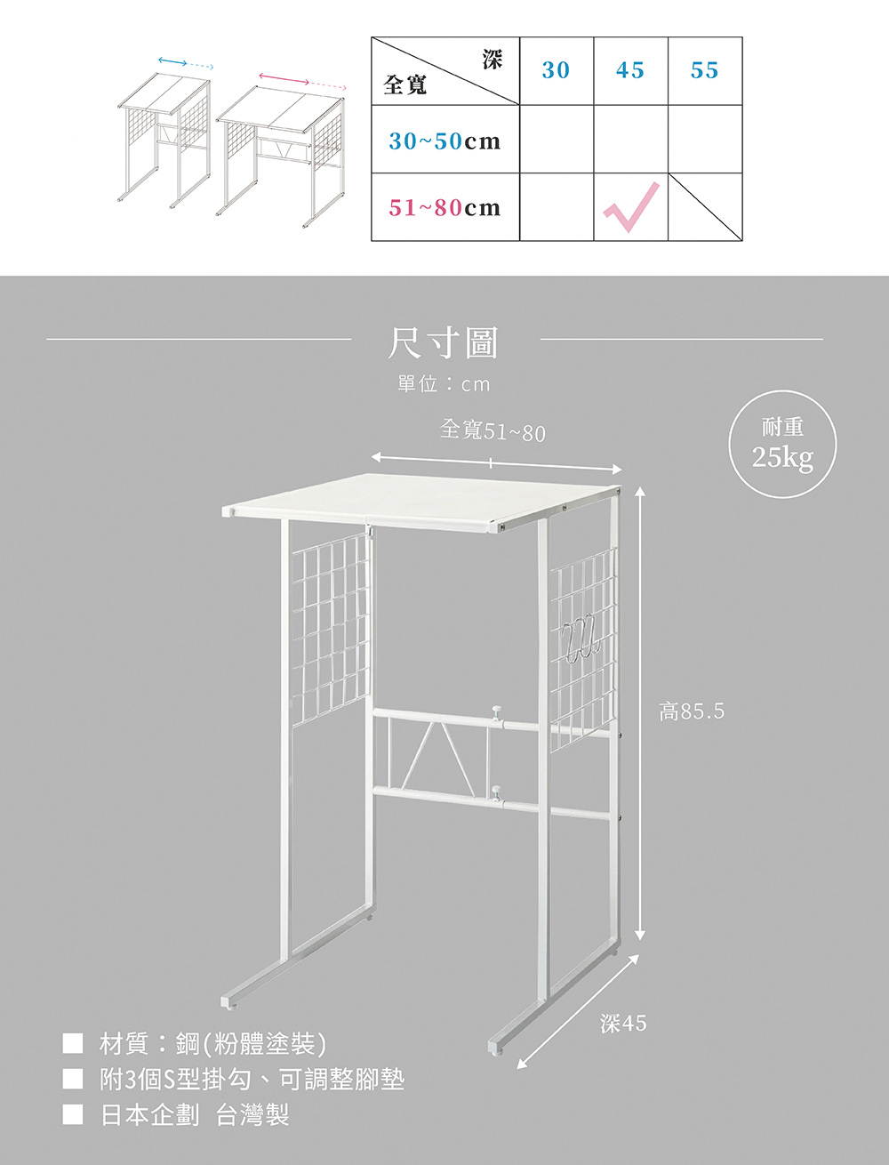 從最小到最大寬度為可調節式伸縮,可依欲收納空間或偏好進行調整。