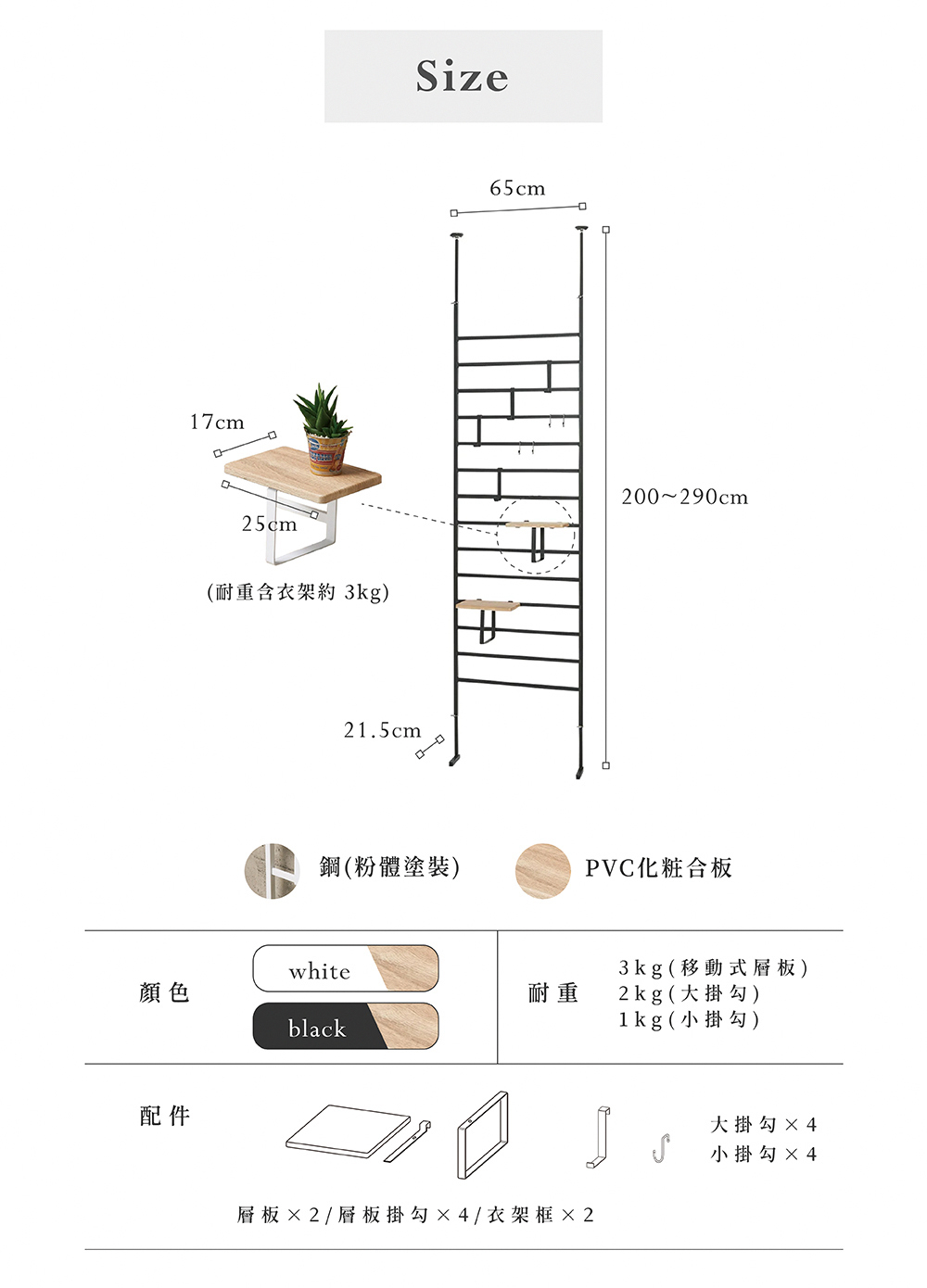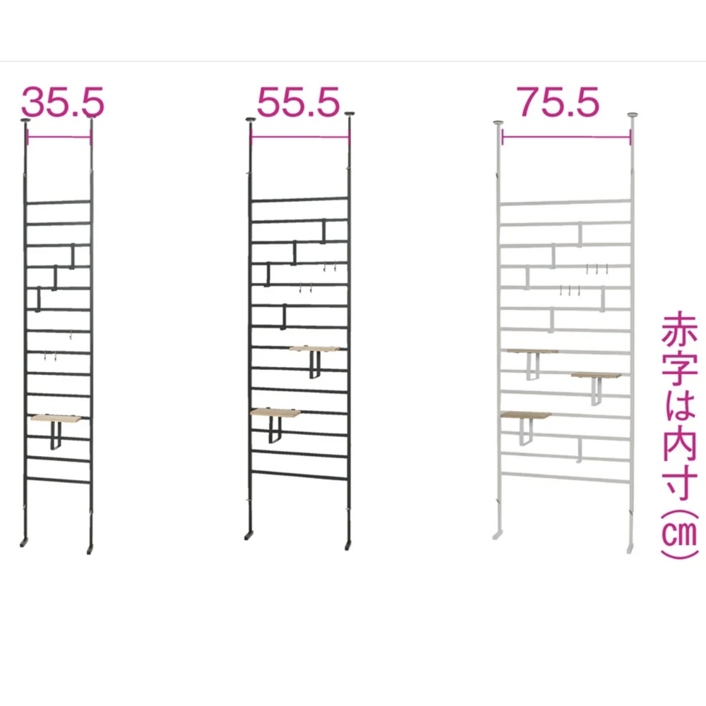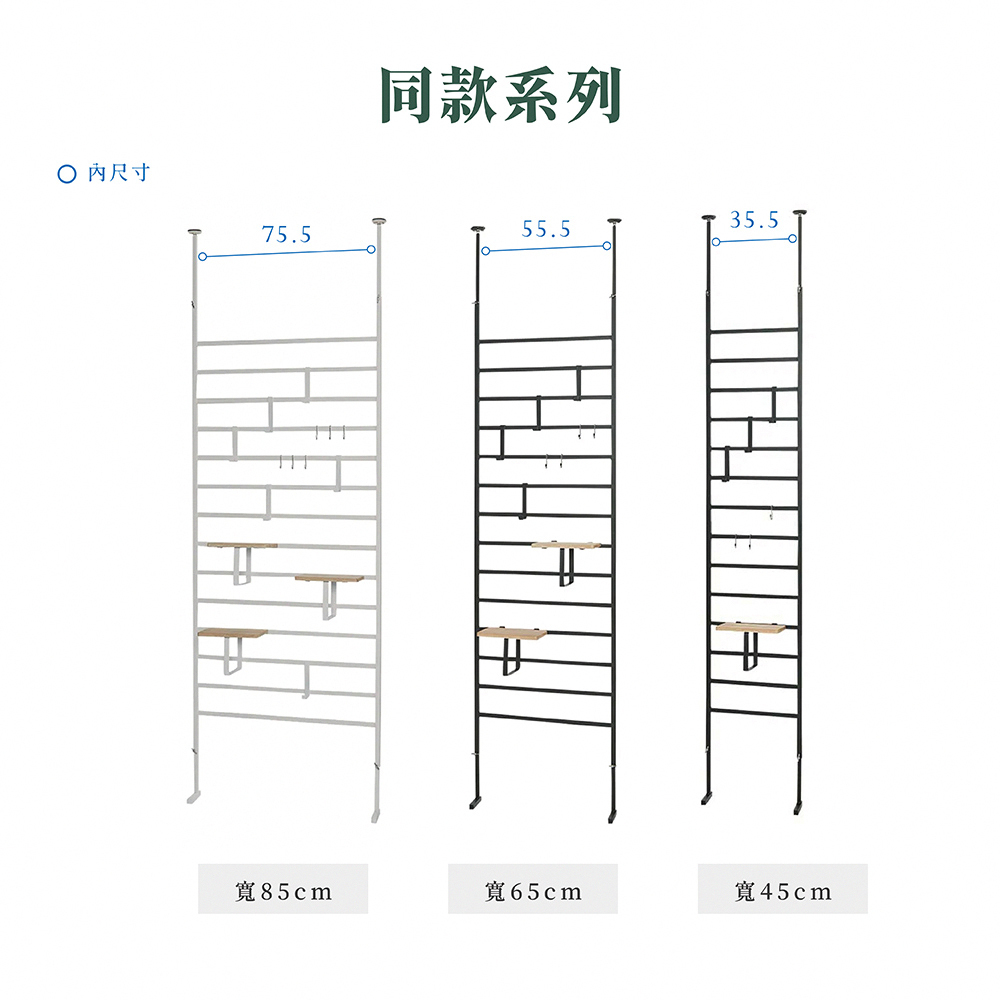 共有寬度45cm・65cm・85cm,3種款式。高度可調整範圍為200cm~290cm,可依照家中天花板高度調整使用。