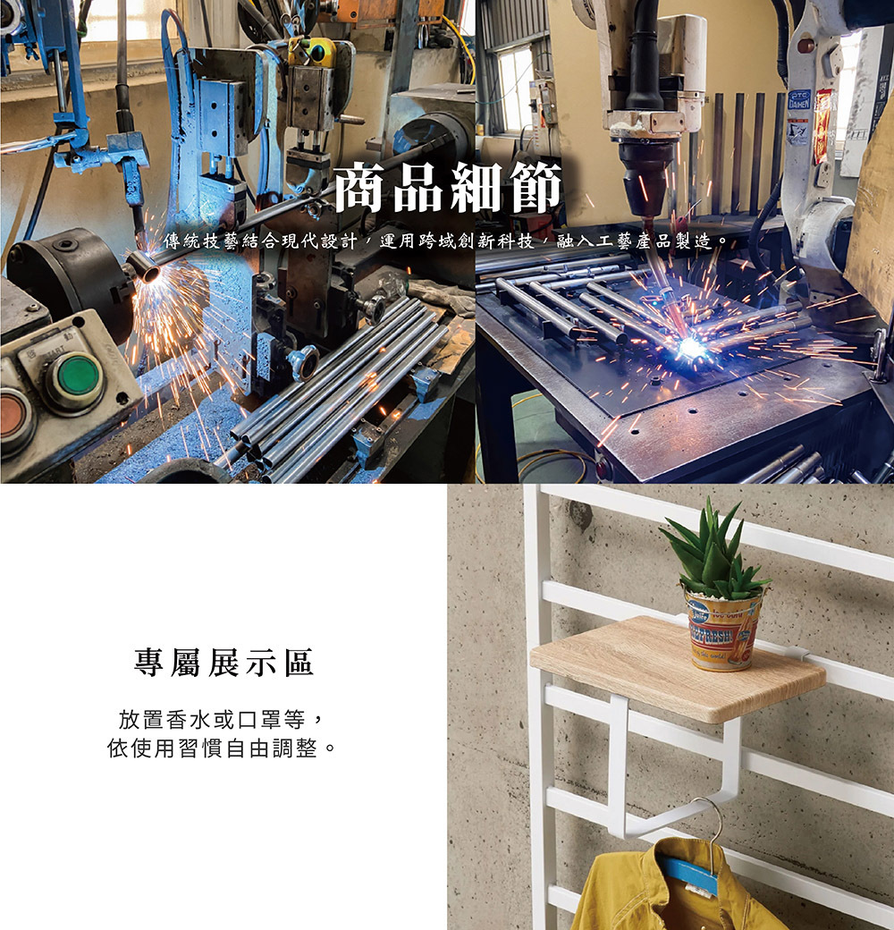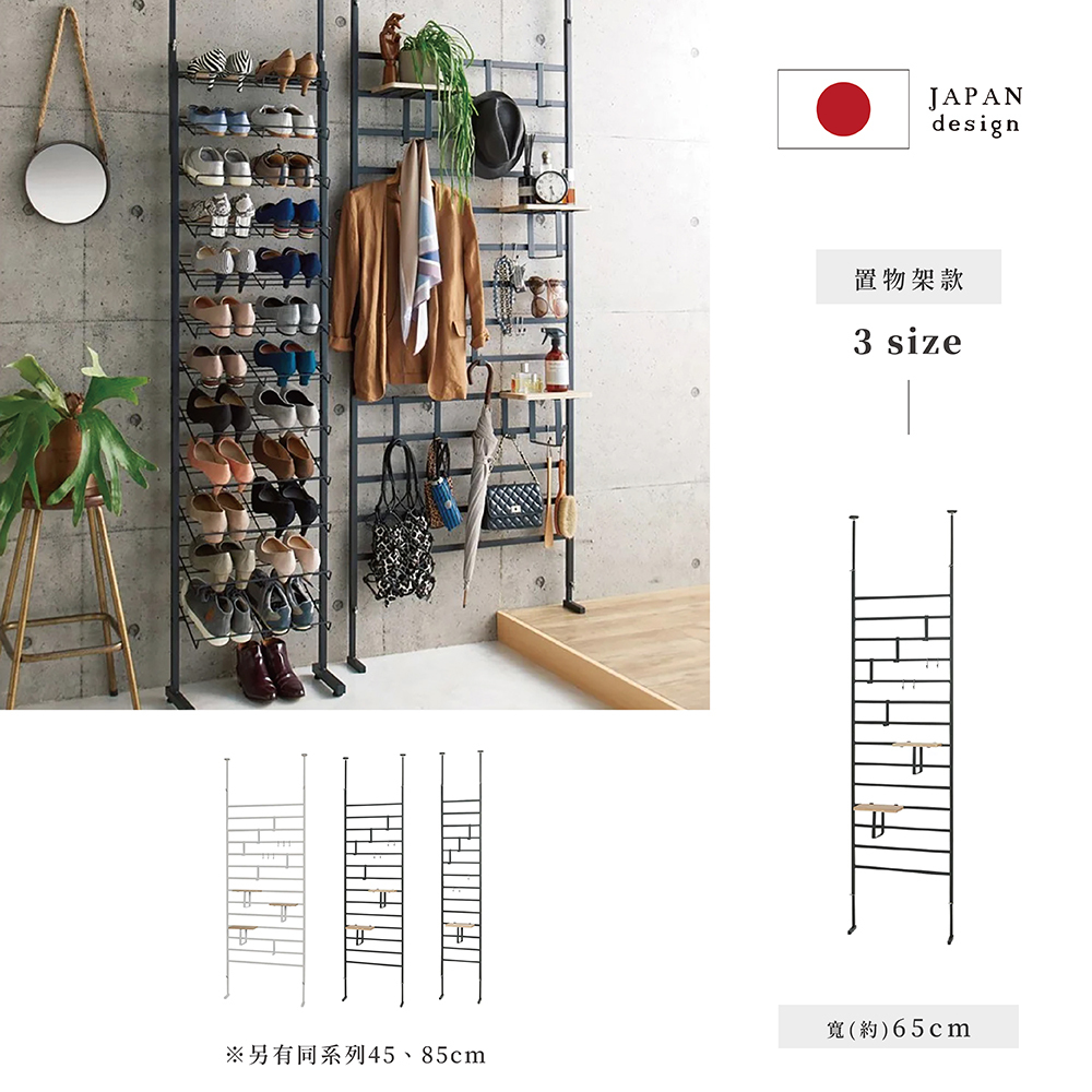下方附有掛衣桿,可掛外衣、圍巾等物品。寬45cm款,附1片層板;寬65cm款,附2片層板;寬85cm款,附3片層板。