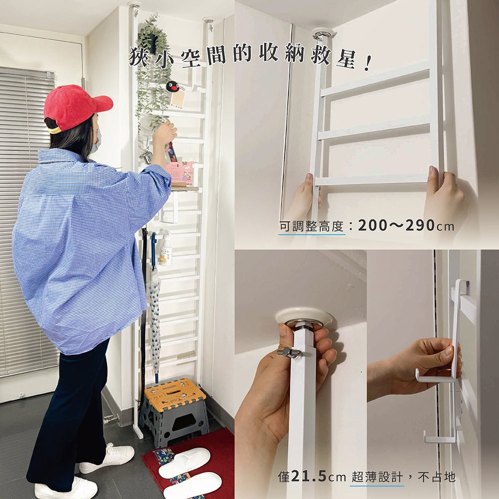 適合玄關周圍小物收納、活用牆面空間的頂天立地式展示收納掛架。如同壁掛式的使用方法,即使是玄關周圍也能節省空間,靈活收納。僅21.5cm的薄型深度設計,狹窄的玄關也能使用。