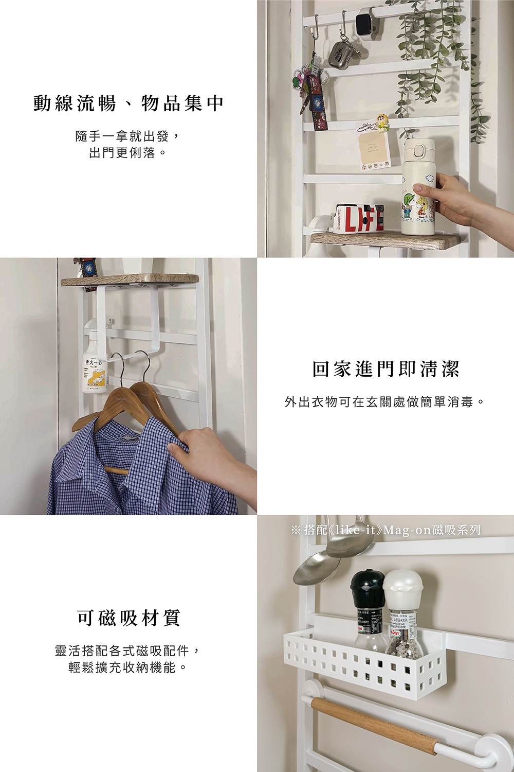 外出時從必備的外衣、帽子、包包、雨傘,到各種時尚小物都能充分收納!將衣物噴霧或消毒噴霧掛式收納,一回到家就能立刻簡單清潔衣物。此外也適合作為房間衣物收納或衣櫃掛架使用。