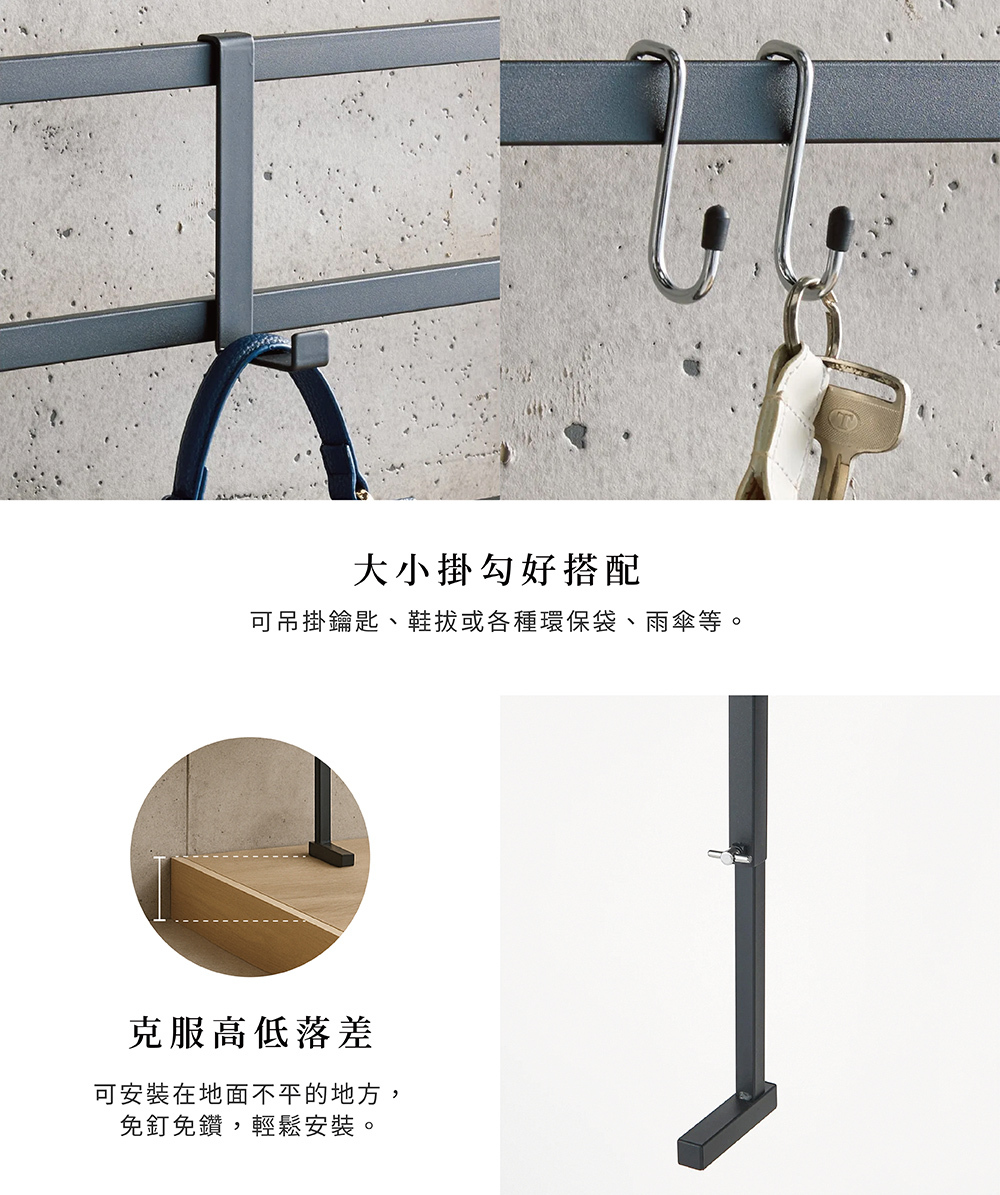 小掛勾適合吊掛鑰匙、鞋拔等小物;大掛勾可掛包包、後背包、雨傘等較大尺寸的物品。