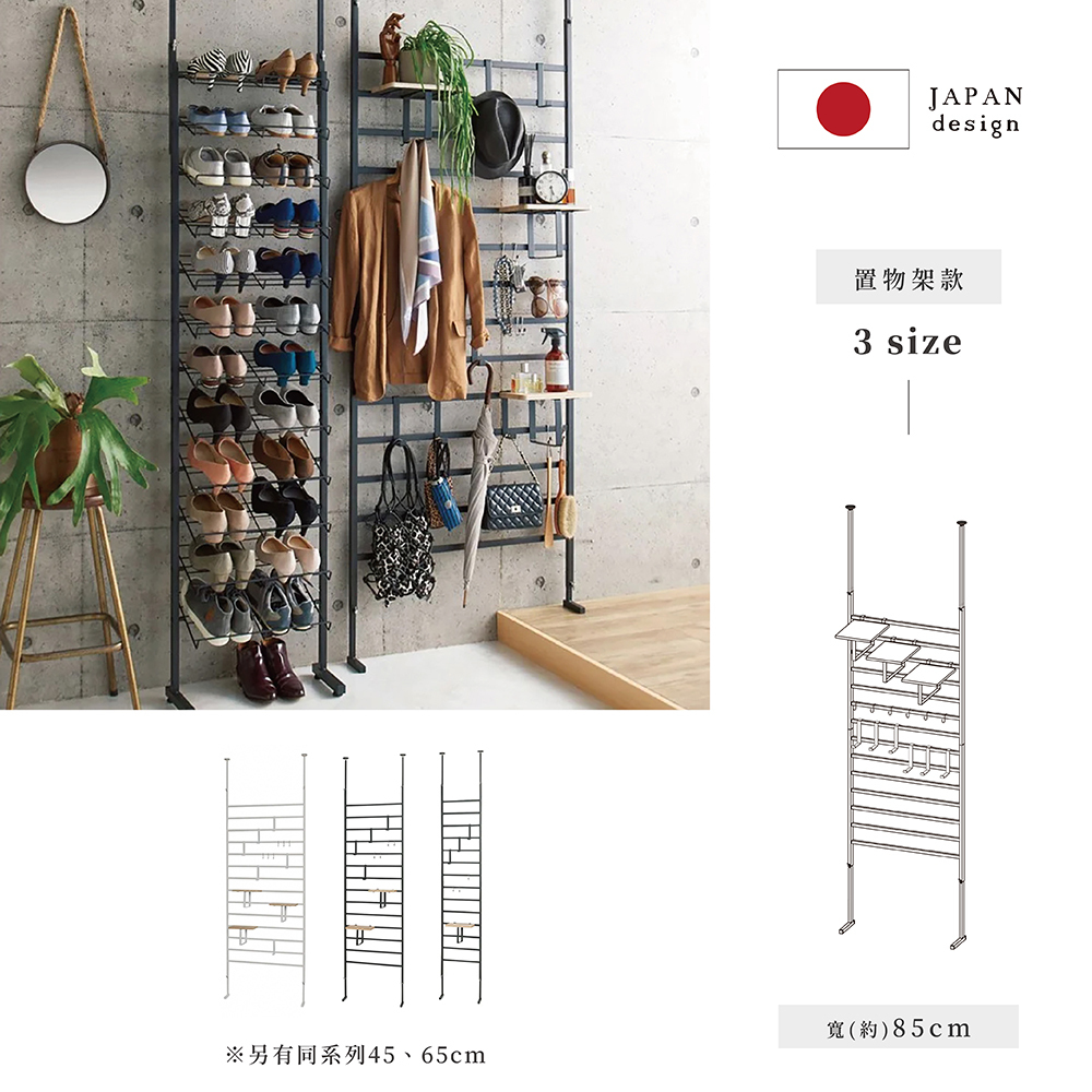 下方附有掛衣桿,可掛外衣、圍巾等物品。寬45cm款,附1片層板;寬65cm款,附2片層板;寬85cm款,附3片層板。