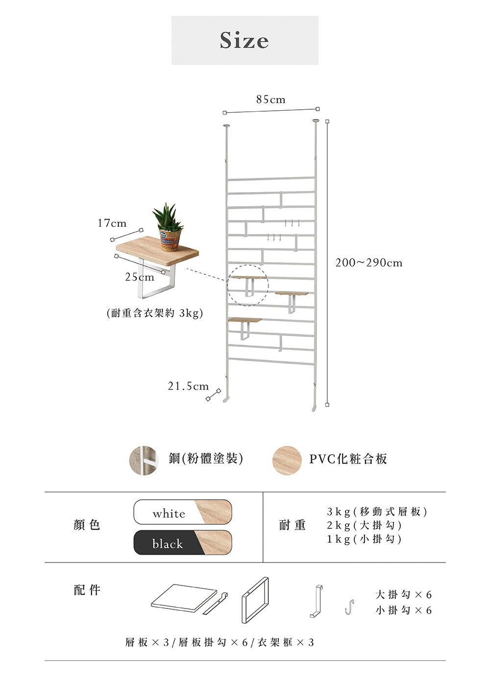 共有寬度45cm・65cm・85cm,3種款式。高度可調整範圍為200cm~290cm,可依照家中天花板高度調整使用。