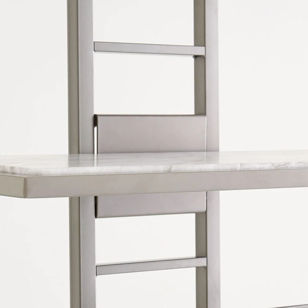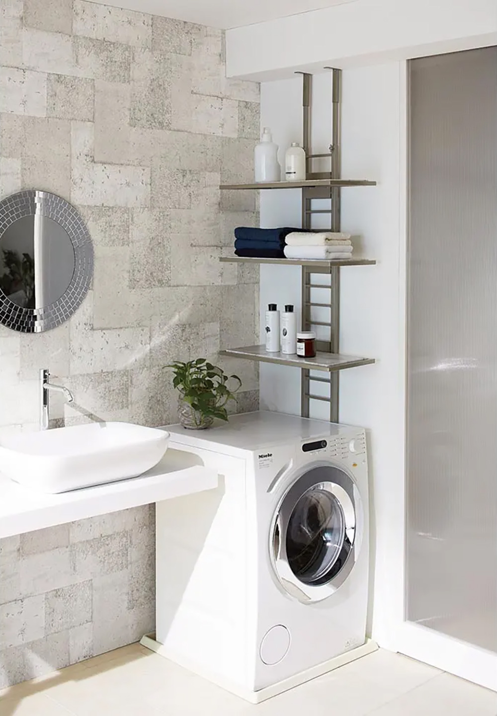 以啞光沉穩的細微銀色呈現,打造如同飯店洗衣空間的壁面置物架。