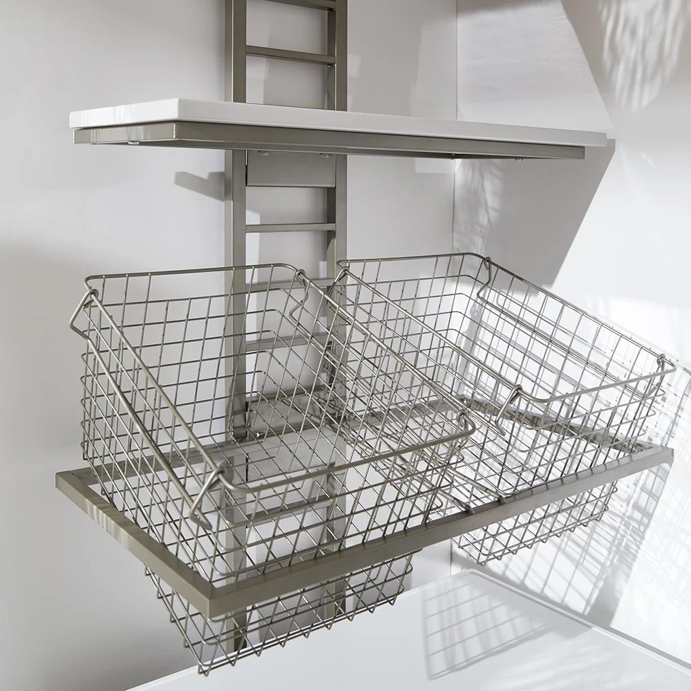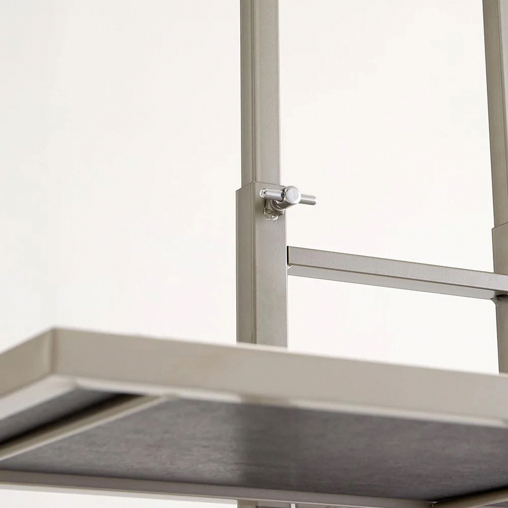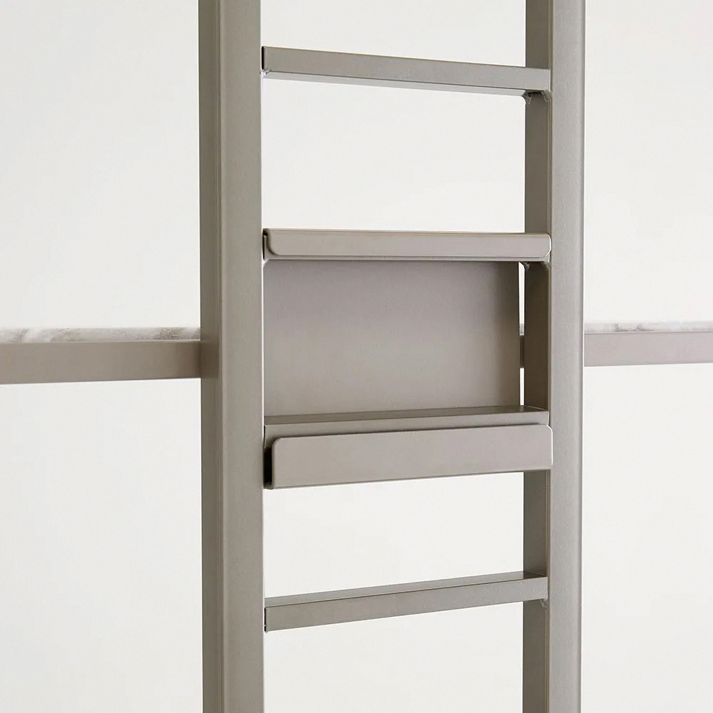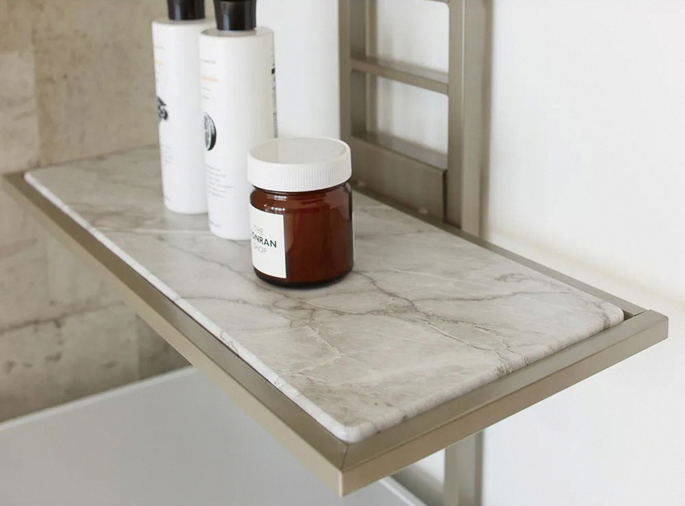 以啞光沉穩的細微銀色呈現,打造如同飯店洗衣空間的壁面置物架。