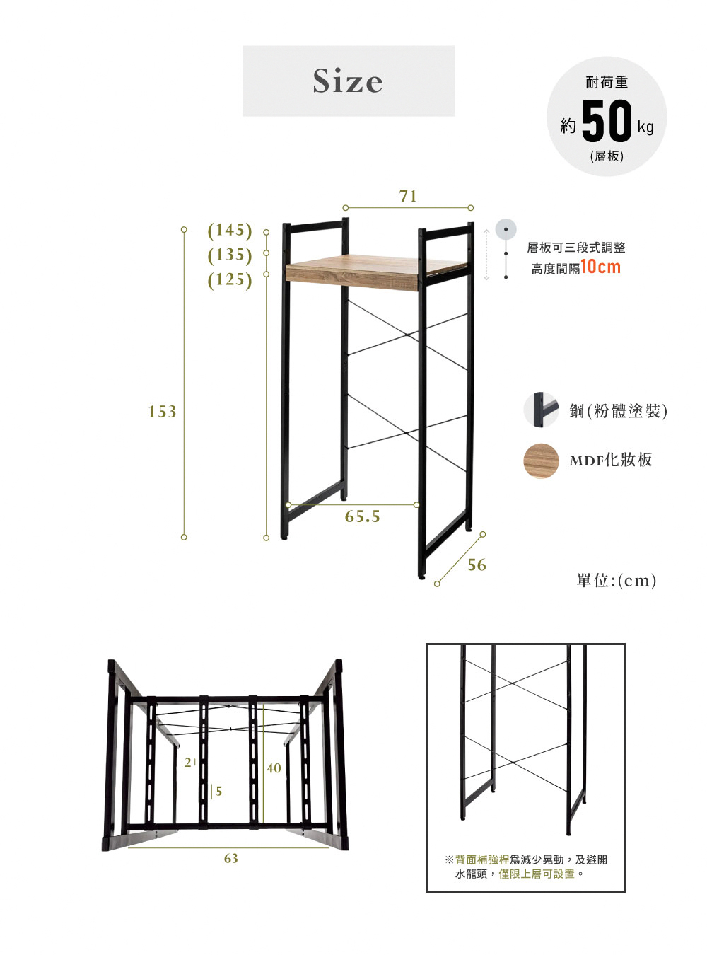 除了可將衣物烘衣機或小型洗衣機等重物,放置於層板使用,也可以取下層板,用螺絲將烘衣機牢牢固定在置物架上,明顯抗搖晃程度升級!